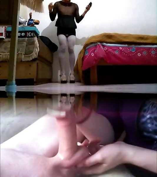 Lovely japanese transgender princess in undergarments wanking on her man rod in sofa