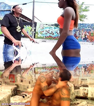 Ebony and Latina shemales pound guy from 2 sides - Real Amateur