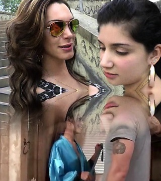 Huge-chested tranny fucking her tight sapphic gf